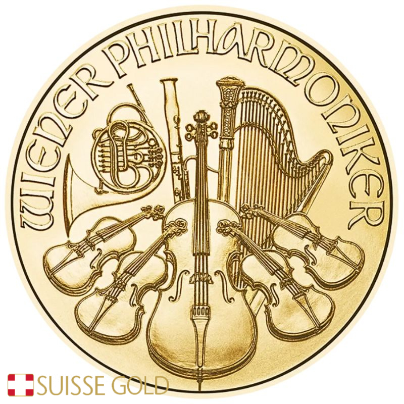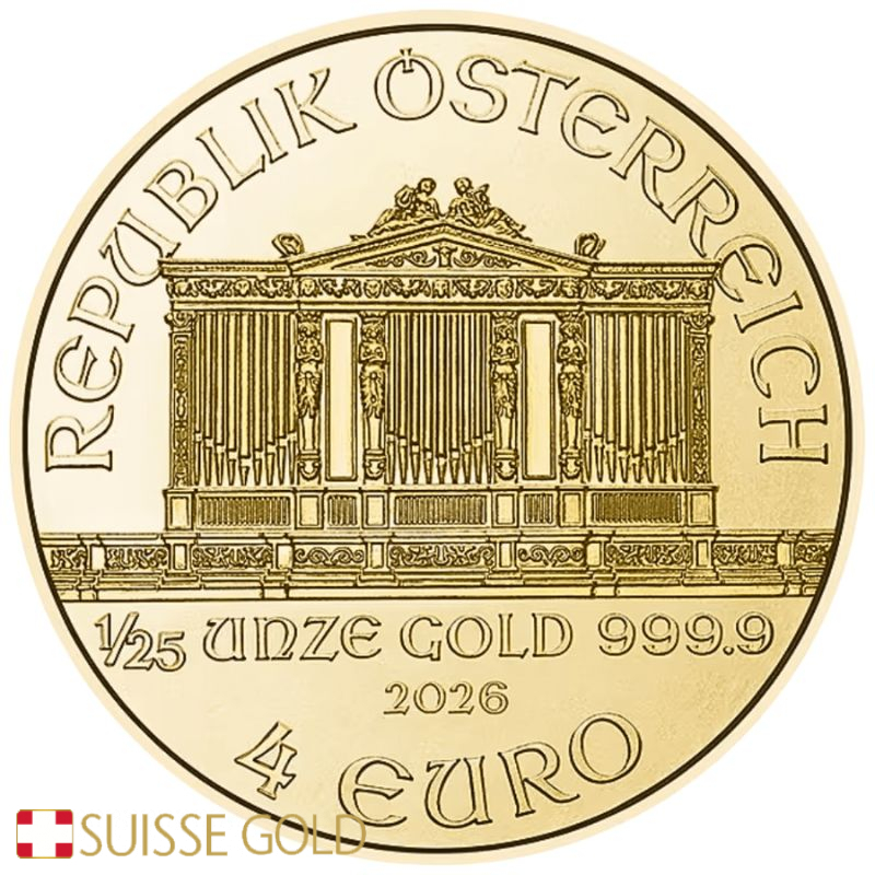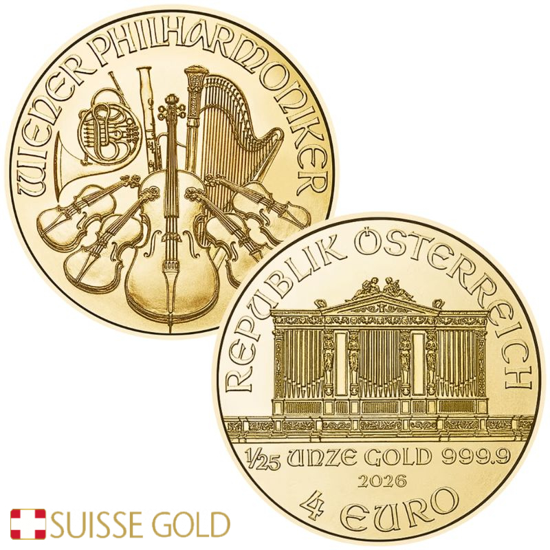 Bei SuisseGold.com können Sie die 2026 1/25 oz Wiener Philharmoniker Goldmünze erwerben mit: