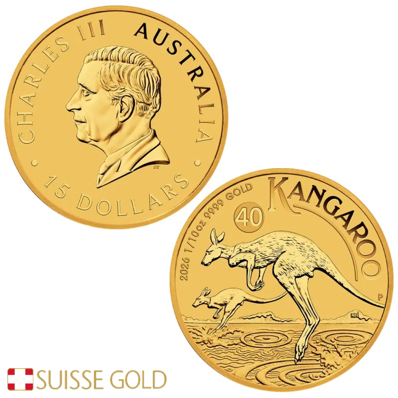 Auf SuisseGold.com können Sie die 2026 Australien Känguru 1/10 oz Goldmünze mit folgenden Vorteilen erwerben: