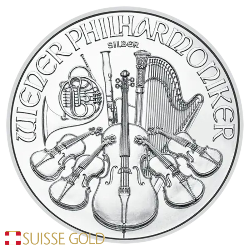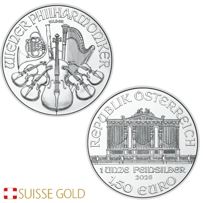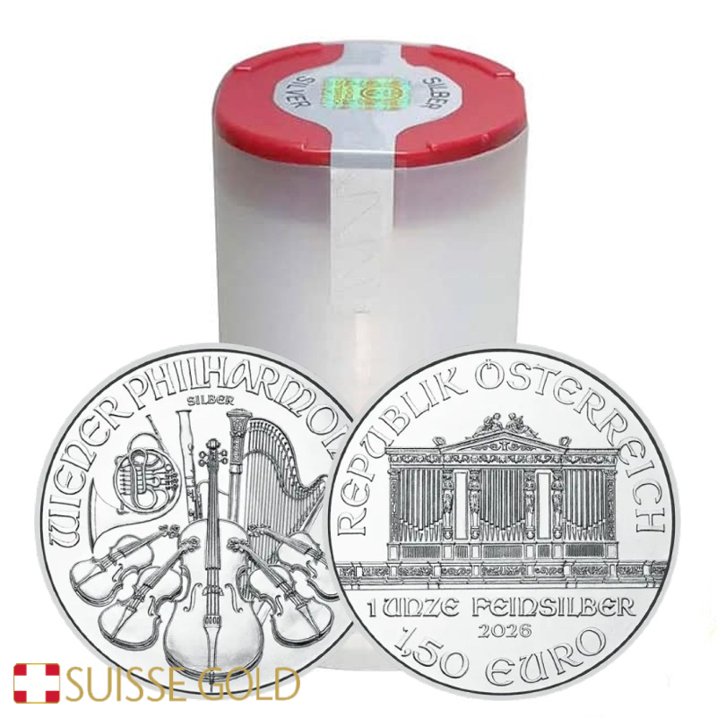 Auf SuisseGold.com können Anleger die 2026 Silber Philharmoniker einzeln, in Tubes zu 20 oder als Monsterboxen zu 500 kaufen.