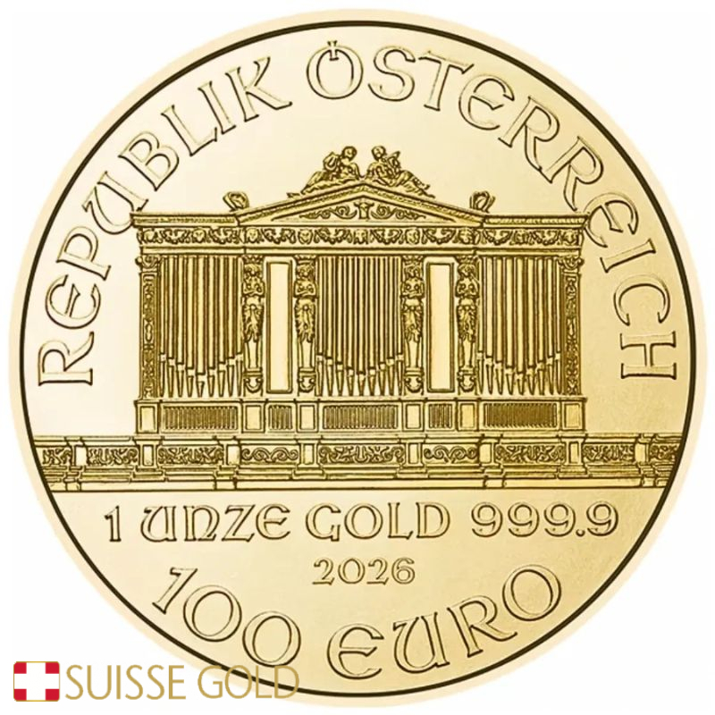 At SuisseGold.com, clients can purchase the 2026 Austrian Philharmonic 1 oz Gold Coin with premium benefits: