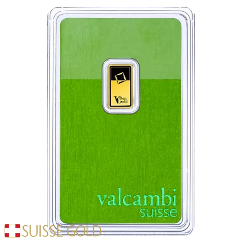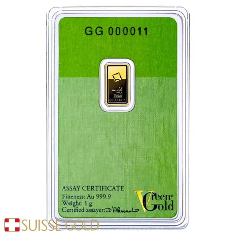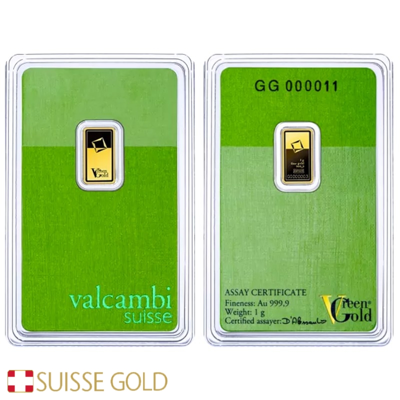 Introducing the Valcambi Suisse 1 Gram Green Gold Bar, a newly minted, uncirculated piece of the highest quality from the acclaimed Green gold series.