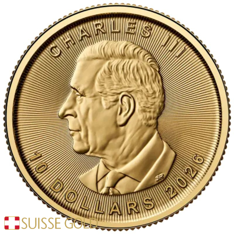 El reverso presenta la atemporal hoja de arce, símbolo nacional de Canadá y uno de los motivos más reconocidos en el mercado del oro. Las inscripciones incluyen el año de emisión “2026”, el peso “1/4 oz” y la pureza “9999”, garantizando su condición de moneda de inversión de oro de 24 quilates.