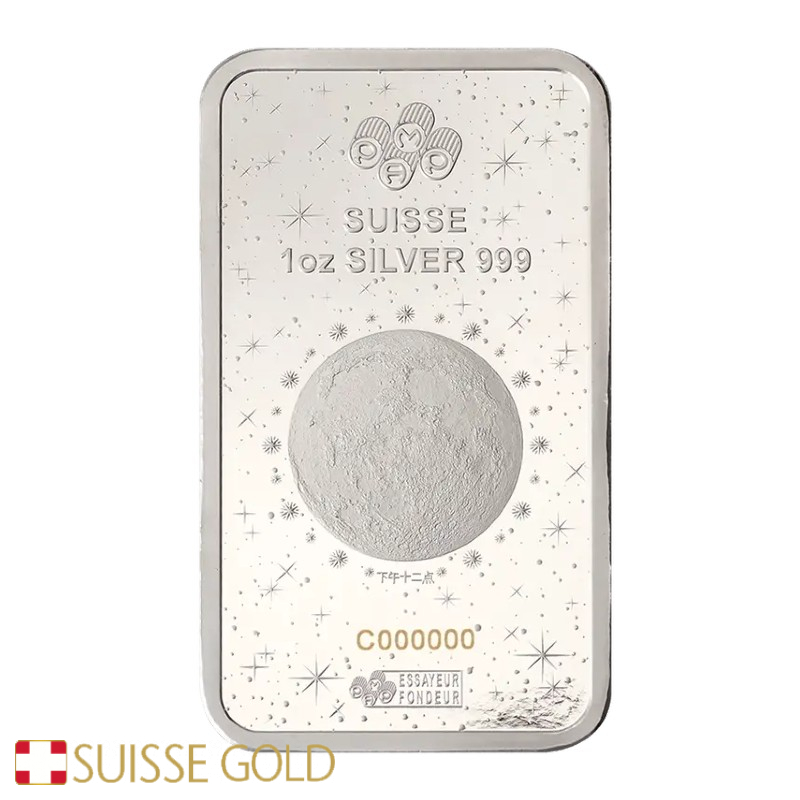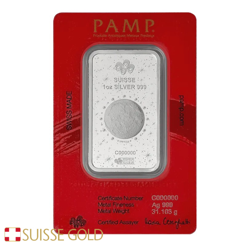 Todas as compras incluem armazenamento gratuito e segurado até um ano nos nossos cofres. Também recompramos lingotes PAMP Lunar em prata.