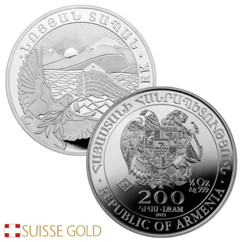 Серебряная монета «Ноев ковчег» впервые была выпущена в 2011 году. Выпуск 2026 года отмечает её 16-й год чеканки. На аверсе изображён ковчег Ноя на воде, восходящее солнце над горой Арарат и летящая голубка с оливковой ветвью — символ мира и обновления. По кругу выгравирована надпись «Noah’s Ark» на английском и армянском языках.